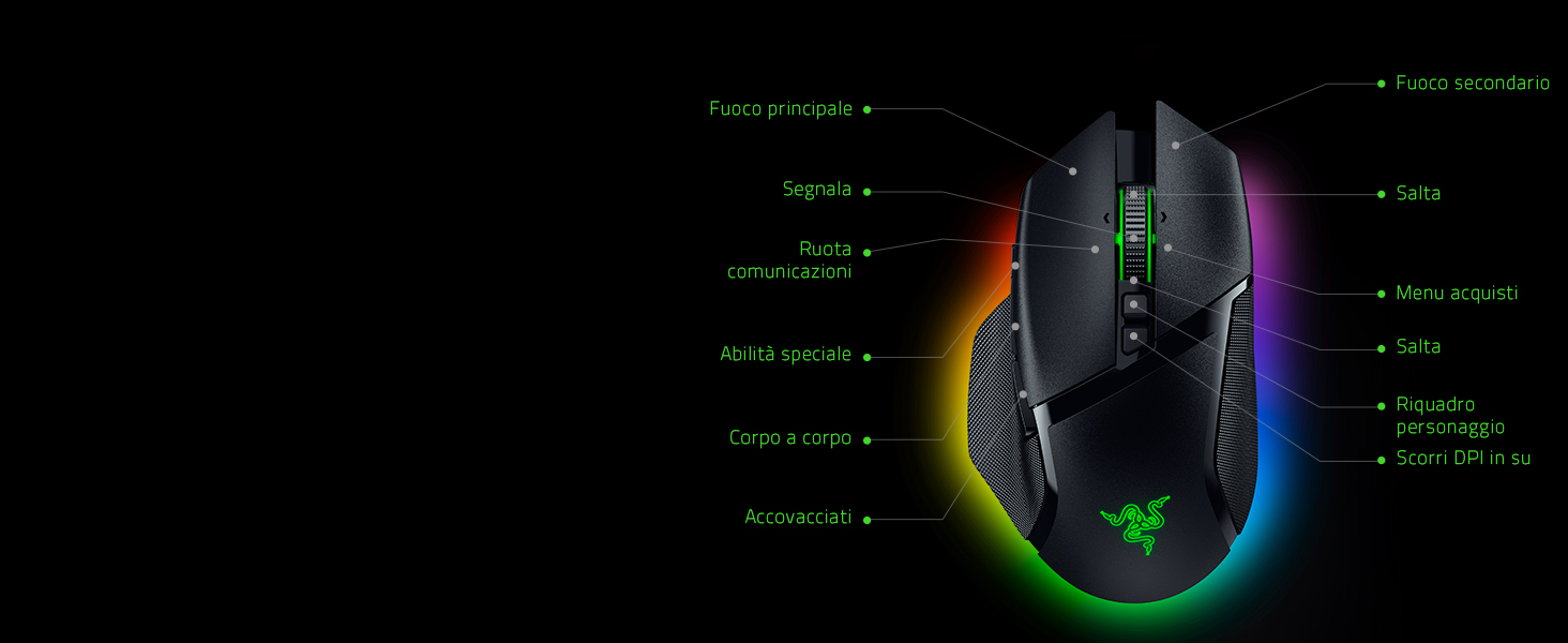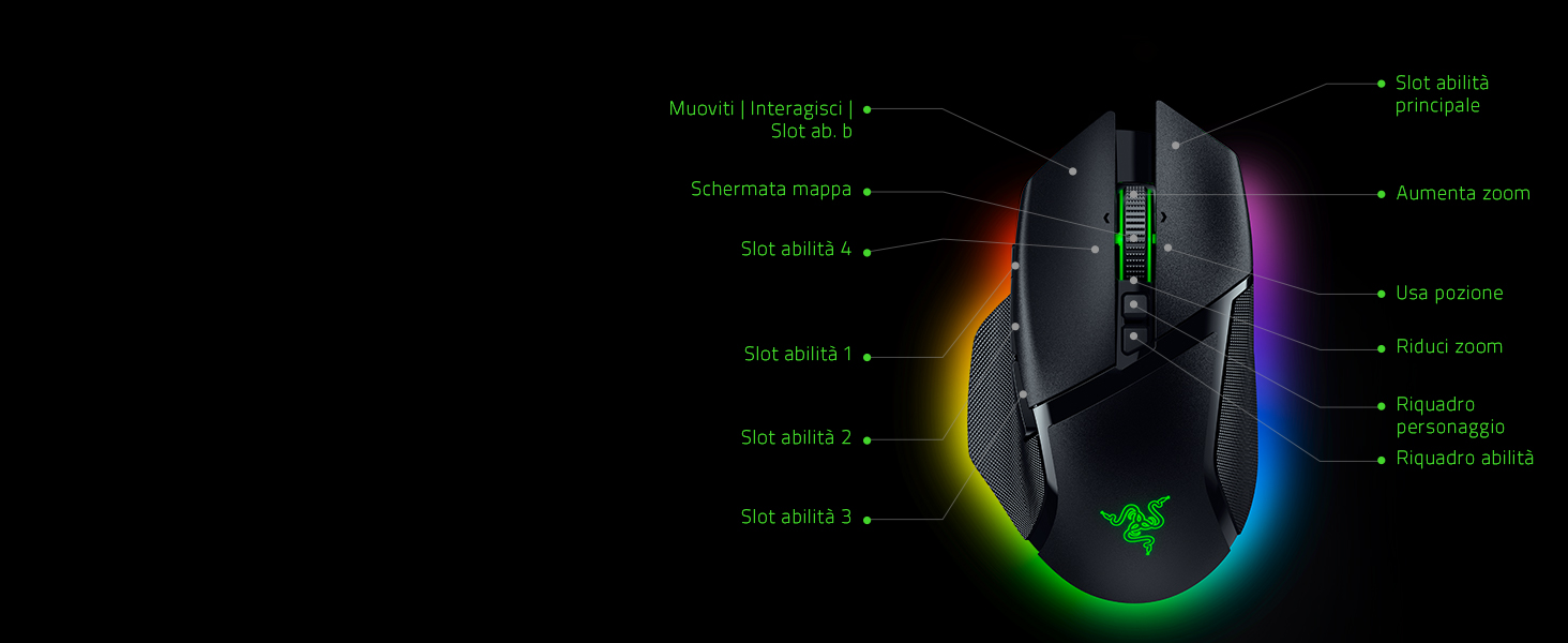 Il design riprende quello della serie Basilisk, con un’illuminazione RGB molto curata: comprende 13 zone personalizzabili con Razer Chroma, tra cui la base del mouse, il logo e la rotellina. Un dettaglio estetico che, soprattutto per chi ama le postazioni luminose, è davvero un punto a favore.