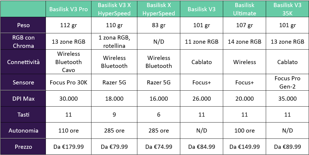 - Razer V3 35K cablato: ha tutte le caratteristiche del nostro Basilisk V3 Pro 35K e costa intorno ai 90€ ma di nuovo… niente wireless.
